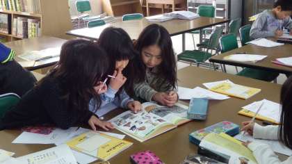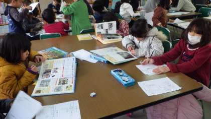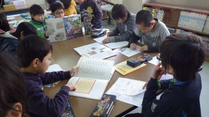 今日は冬休み中に整理された第二図書室へ行き,地域のお年寄りの方が昔使っておられたような道具について,本で調べました。