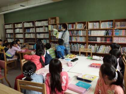 本棚の本の並び方や,貸し出しの方法,本の扱い方の話を聞きました。