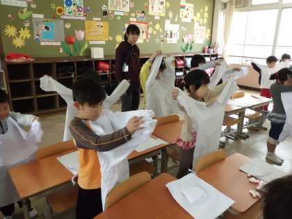 給食が始まる前に,栄養教諭の野秋先生に給食のこと,エプロンのたたみ方などを教わりました。