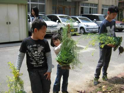 子どもたちは「今年も野菜を育てるんだ!」とやる気満々で草をとり,ガーデンを耕しました。