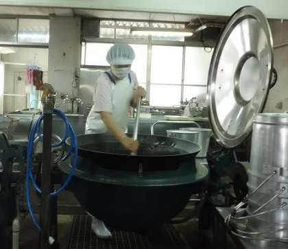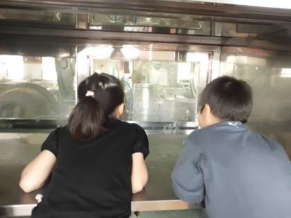学校探検では,給食室にも行き,普段おいしくいただいている給食がどのように作られているかを見ました。