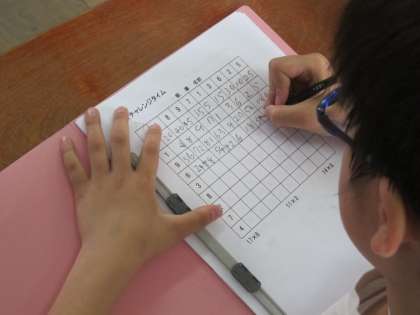 いまはかけ算の100マス計算です。