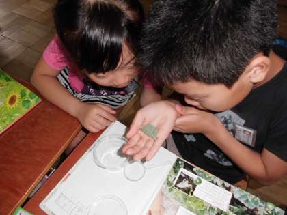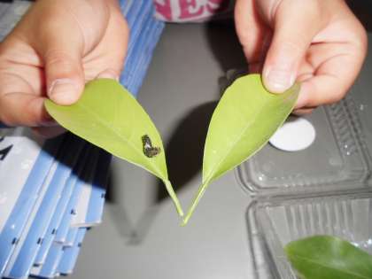 実際に葉っぱについているたまごを見て「ちっちゃいー!」「こんなに小さいんや〜」と驚いていました。