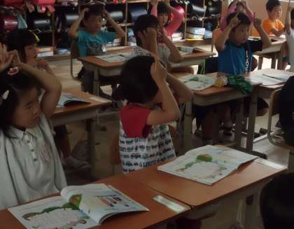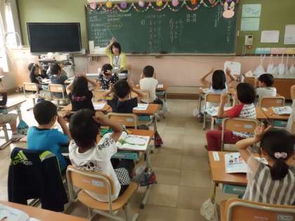 体を動かすことが大好きな1年生は,ノリノリでかたつむりになりきって歌っていました。