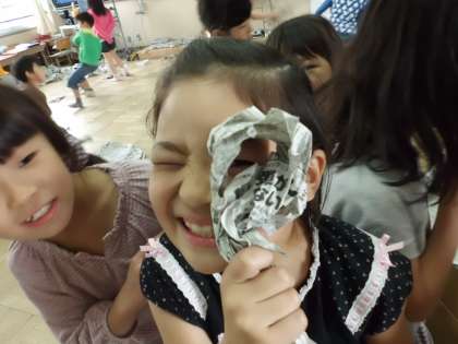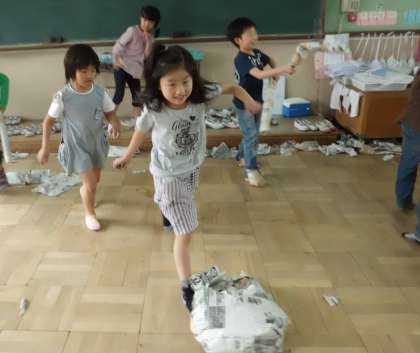 丸めてサッカーをしているところと,ねじって虫眼鏡にみたてているところです!