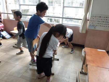 重い机も友達と力を合わせ「よいしょ,よいしょ!」と運んでいます。