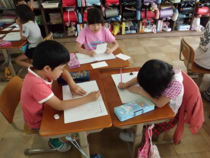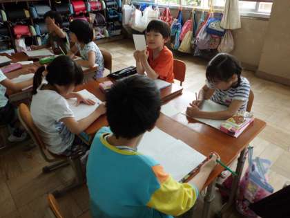 グループで一人が伝言を伝え,残りの子がメモをとりました。
