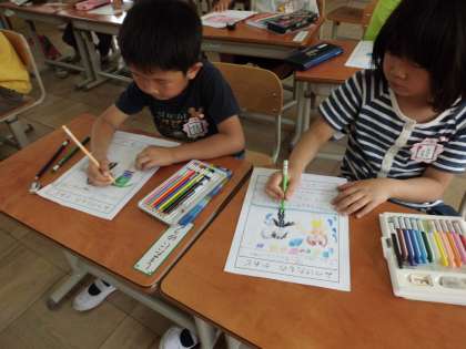 まだひらがなをすべて習っていない子どもたちですが,先生にわからないひらがなを聞きながら,一生懸命文章や絵をかきました。