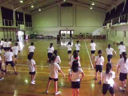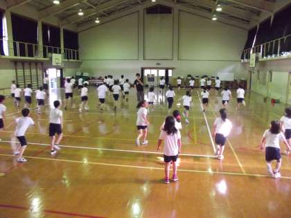 初めにフットワークをして,ドリブルシュートの練習をしています。