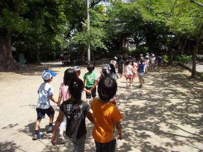 小学校の前にある藤森神社。「よくあそびにいってるよ。」「おまつりにいったことがあるよ。」という子どもたちもいますが,「はじめていくよ。どんなところだろう。」と興味津々で出かけた子どもたちもいました。鳥居の前まで来ると「あっ,お馬さんが走ってたところや。」と5月5日の駆馬神事を思い出して楽しそうにエピソードを聞かせてくれる子も。あじさい苑のあじさいも咲き始めていて,18日のあじさい祭りを心待ちにしている声も聞かれました。