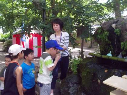 神殿横の湧水を口に含んで「あまい!」と笑顔を見せる子どもたち。これから季節ごとに訪れて,四季の変化をみていきたいと思っています。