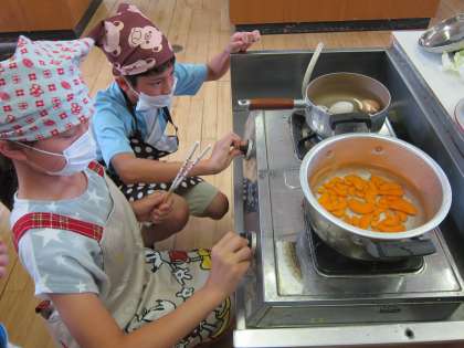 ガスコンロの使い方は前回学習したので,そのときのことを思い出しながら火をつけました。