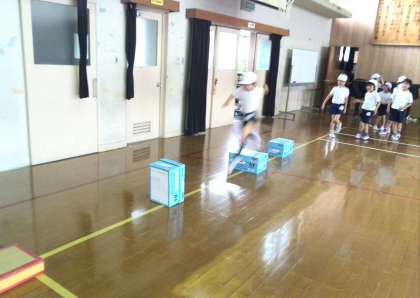 箱をリズムよく跳んでみたり,ゴムとびで高さに挑戦してみたり,幅跳びのように跳ぶ距離を競ったりしました!