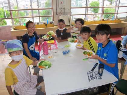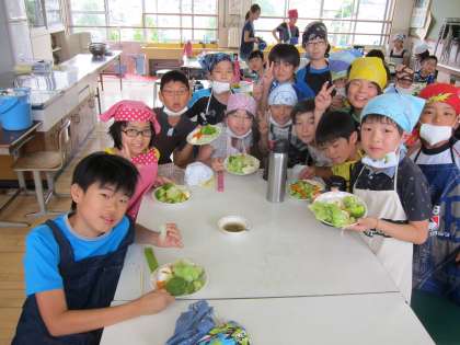 片付けが一段落しました。みんな自分たちで作ったサラダを持って,はいポーズ!