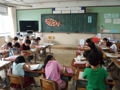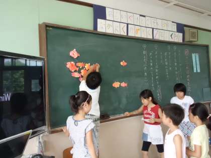 物語の読み取りも最後の場面となりました。図画工作で作った赤い魚を使って,スイミーと赤い魚たちの気持ちに寄り添いました。最後にスイミーに,心を込めて手紙を書きました。
