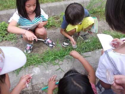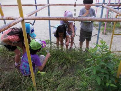 運動場に出て,昆虫などの動物を探しました。