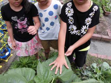 葉の大きさを手のひらと比べると,手のひら2つ分以上の大きさになっていました。