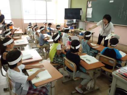 自分達で作ったお面をかぶり,まずはみんなで音読です。