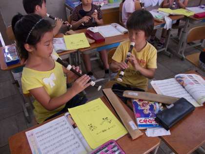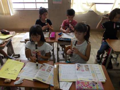 音楽の学習で2つのパートにわかれてリコーダーを吹きました。