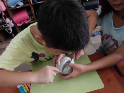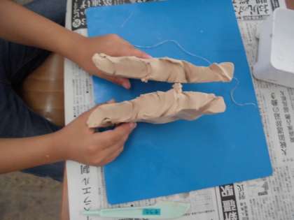 大きなかたまりから,はり金で切ったり,へらでけずったりして,ひみつの遊び場を作りました。