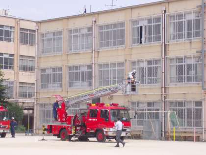 消防士さんが取り残された人を救助している様子を見学しました。