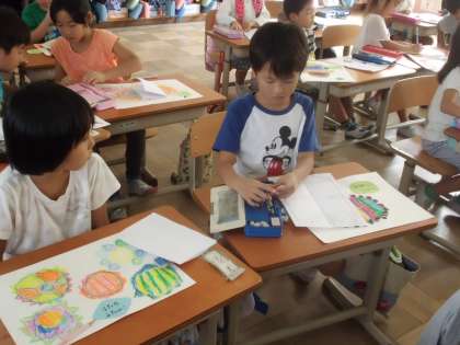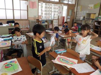 図工の作品をみんなで鑑賞。画用紙に描いた個性たっぷりのおひさまの絵を,みんなでみてまわりました。「カラフルで格好いいです」「大きく描いてあるところがいいです」「貝殻のようできれいです」など,発表することができました。