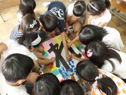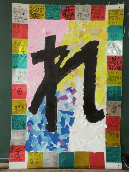 自分たちの思いを書いた紙を貼った後,「れ」の文字を書くチームと,ちぎり絵のチームにわかれて活動しました。