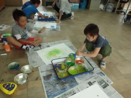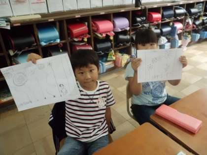 図工では,各組で取り上げた物語の絵を描いています。場面を想像して色を選んだり,登場人物の顔を思い浮かべて描いたりしています。
