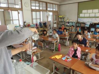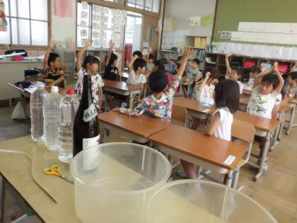 算数ではかさの学習をしています。色々な容器に水を入れて,どっちが多く水が入っているか勉強しました。同じ大きさの容器で比較すると,どっちが多いかわかりやすいことを知ることができたようです。水が出てきてみんな盛り上がっていました!