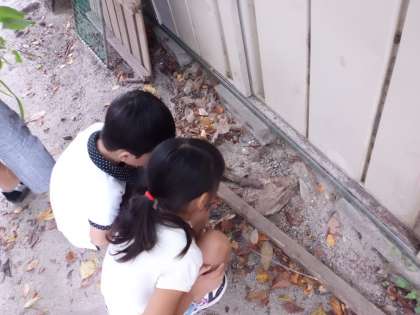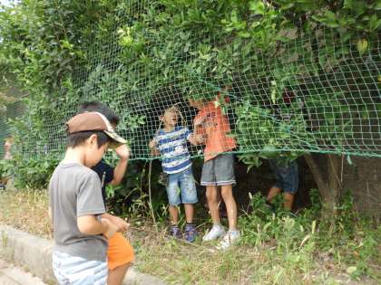 校内にいる虫を探しに,運動場や花壇に行きました。木をどけてみると,虫がいっぱい!虫以外にも,みかんの木や,その他の草花が咲いているのを発見していました。
