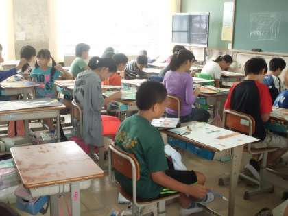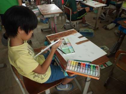 絵の具を使う時は,水の量を調節し,場面に合わせて濃淡を考え塗っています。