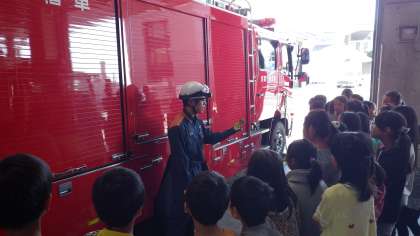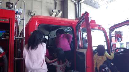 消防自動車の説明を聞き,車にも乗せてもらいました。