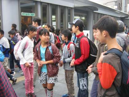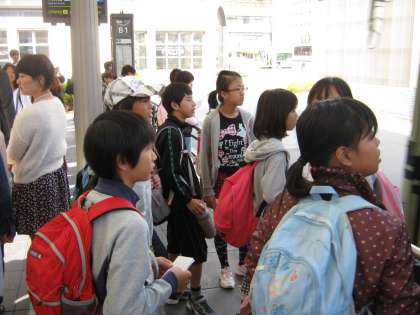 どこのバス停で乗ると目的地に着くのか,みんなで確認しながら移動しました。