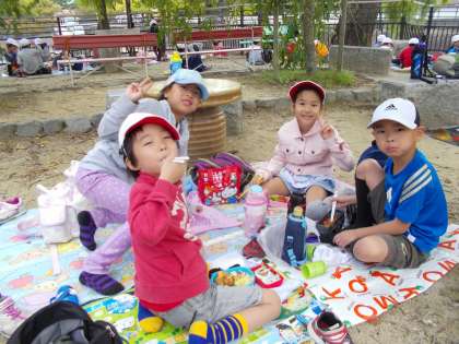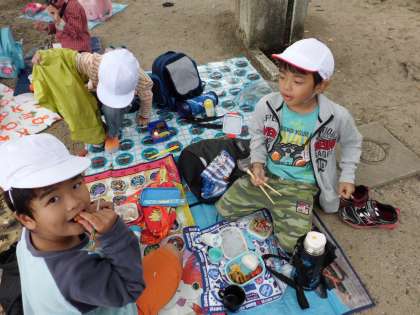 お弁当タイム!!お弁当自慢大会のように,「カニさんウインナー入ってるよ!」「大きいおにぎり二つも入ってる!」「くだものもあるよ!」と先生や友達に見せ合っていました。とても楽しみにしていたのが,すごく伝わってきました。