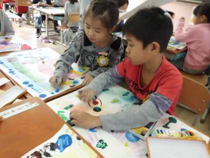 図工では持参したカップやスポンジなどに絵の具をつけてペタペタ。いろんな模様が出て楽しかったようです。その上にクレヨンで絵を付け足して模様が違う形に変身していました。