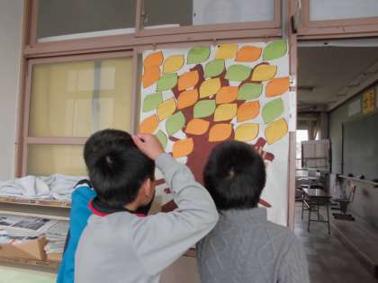 今月は,読書月間で全学級が取り組んだ「読書の木」の選考をしました。学年の中で,もっとも立派な読書の木を育てた学級に賞状を贈ります。真剣に内容を読みながら考えていました。
