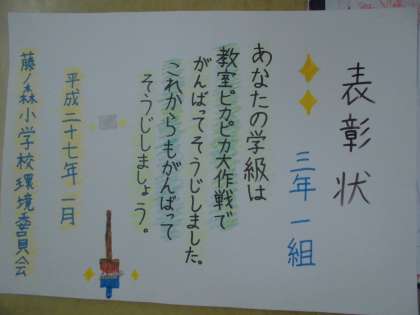 環境委員会から教室ピカピカ大作戦の賞状をもらいました!!