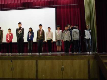 大文字駅伝に出場した子どもたちは,校長先生からメダルをかけてもらいました。