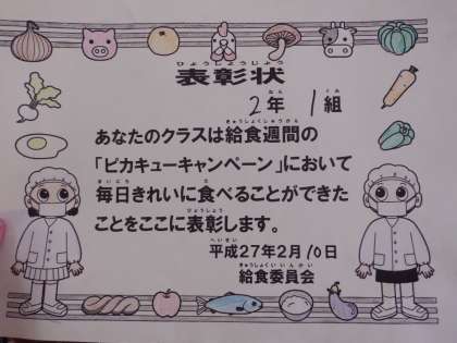 給食委員会から,ピカキューキャンペーンの表彰がありました!