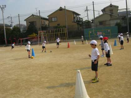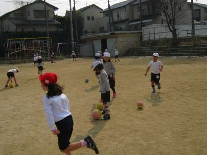 寒い日が続きますが,1年生は運動場で元気にボールけりゲームに取り組んでいます。初めは,ボールが遠くまで転がってしまったり,思う方向に転がらなかったりしましたが,徐々に力の調節も上手になり,ペアの相手のところまでうまく転がるようになってきました。