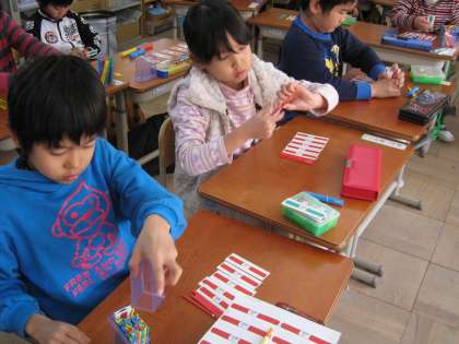 1年生初めの算数では1〜10の数を考えるのに精いっぱいだった1年生も,今では100をこえる数を学習しています。大きな数の計算に少し難しそうな顔もしていますが,数え棒で確認しながら頑張っています。少しずつ難しいことにもチャレンジしながら,2年生に近づいていっているんだなと感じた一瞬でした。