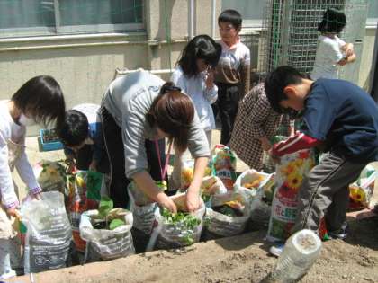 大きな土の袋の上をはさみで開けて、そこに苗を直接植えました。