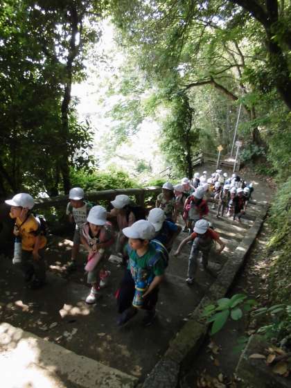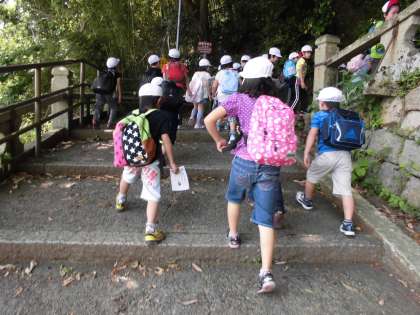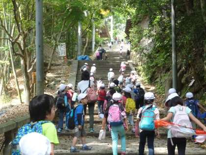 「今何段かな。」「もう100段超えたよ!」と数えながら登っています。「1年生のときの大吉山よりしんどいなぁ…」とつぶやく子もたくさんいましたが,みんなしっかりと登りきることができました。一段とたくましくなっている様子に驚きました。