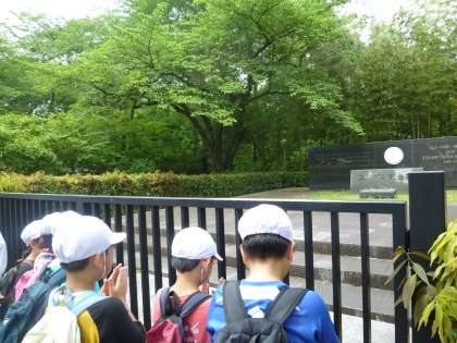 レクリエーションセンターへ向かう途中に,「エジソンの記念碑」と「宇宙桜」がありました。エジソンが発明した電球のフィラメントには,八幡の竹がぴったりだったそうです。宇宙桜は今の2年生が1歳だったころにロケットにのって宇宙旅行をした桜の種が芽吹いて接ぎ木したものだそうです。子どもたちは興味深そうに聞いていました。