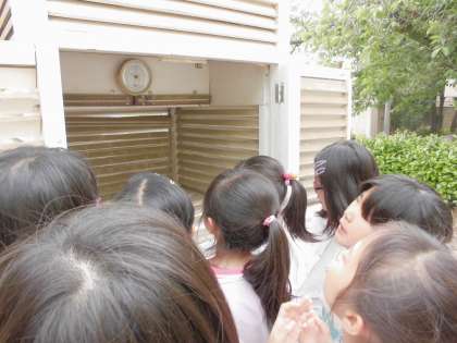 「百葉箱を利用して気温を計ると,どんなよさがあるのだろう。」この学習課題に対して予想をたて,教科書で調べました。ずっと目にはしていたけれど,中を見るのは初めてで,ドキドキしながら開けると・・・・。「えっ・・?」あまりにも殺風景・・・。どれが温度計かわからない・・・。おそらく藤ノ森小学校の百葉箱はかなりのご高齢。いろいろな思いを持って,学習を終えたのでした。