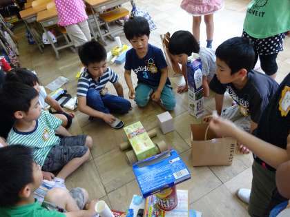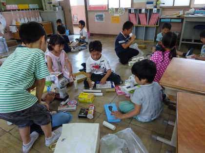 家から持ち寄った空き箱を使って,いろいろな形を作りました。