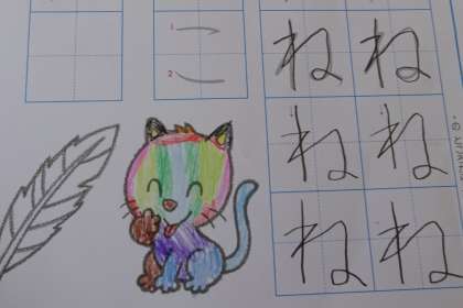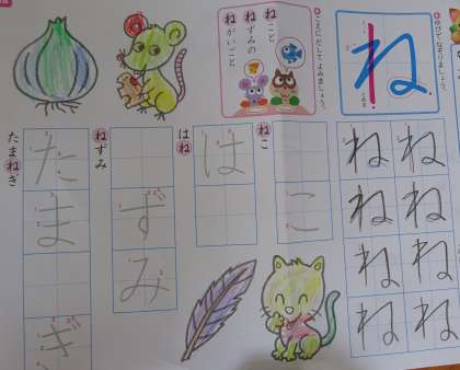 ひらがなの学習プリントの色塗りをカラフルに塗っている子がいました。