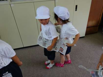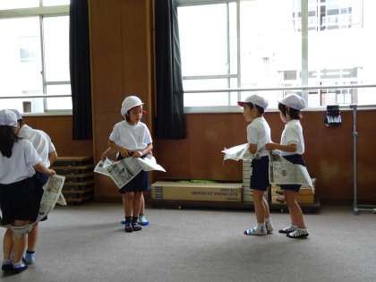 友だちと力を合わせて,新聞紙が破れないように進みます。