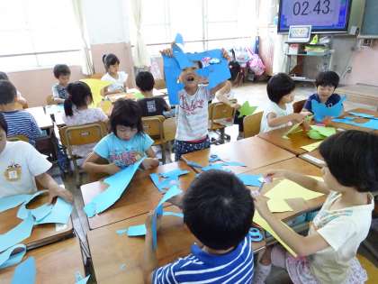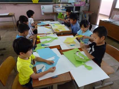 紙をいろいろな形に切ったりやぶいたりして,その形からイメージを膨らませて絵を描く学習に取り組んでいます。自由に切ったりやぶいたりして,「○○みたい」と嬉しそうに想像する子どもたちの姿は,とてもいきいきしていました!