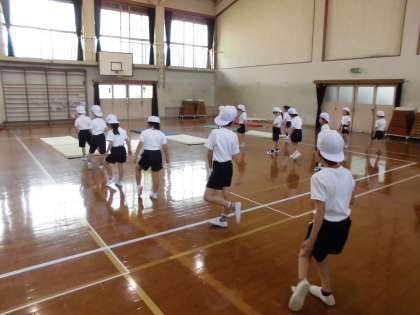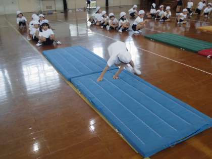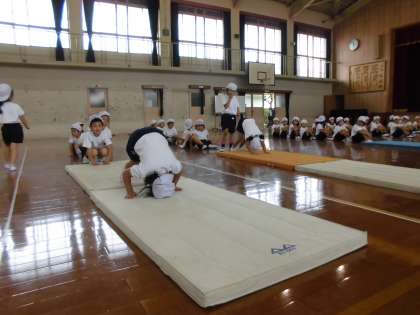 「みずあそび」の学習と並行して,「マットあそび」の学習にも取り組んでいます。マットの運び方,体操の仕方(特に,足首・手首・首を念入りにすること)を確認しました。「前まわり」「横まわり」「後ろまわり」等,いろいろな技にも挑戦しました!